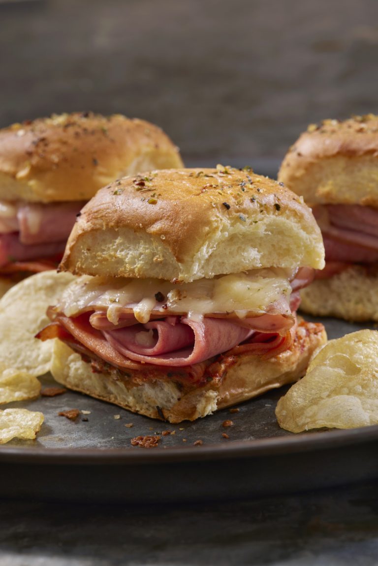 - Remove from the oven and cut each slider apart from the others. Place on a plate and serve warm!