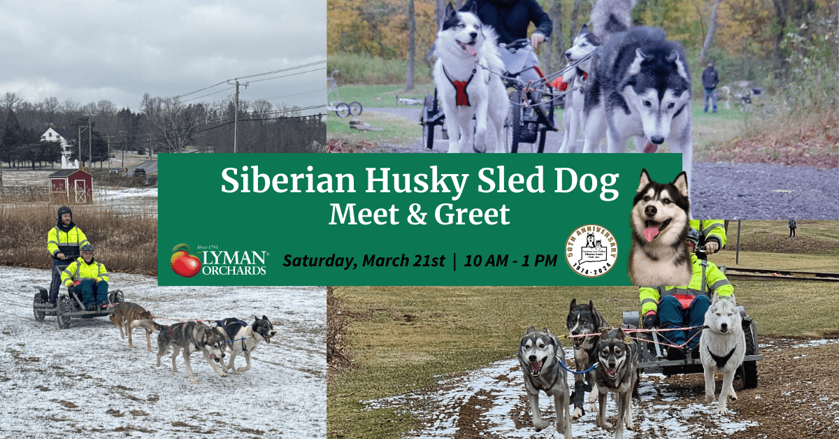 The Siberian Husky Sled Dogs will be outside at the Apple Barrel Farm Market on Saturday, March 21st from 10 AM - 1 PM.