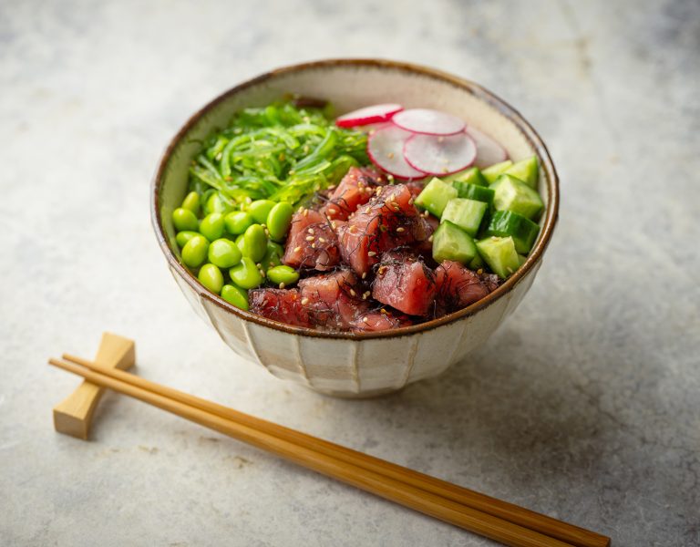 - 1 pound sushi grade ahi tuna, cut into ¾" cubes