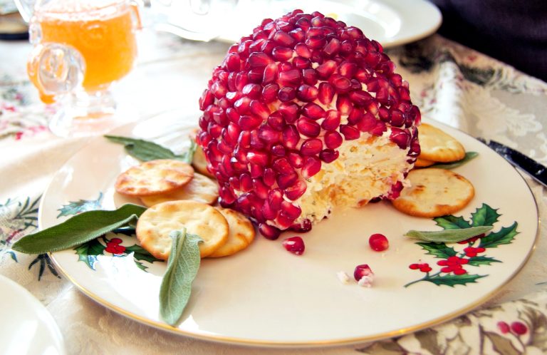 After 30 minutes, mold the cheese into more of a smooth ball. Add the arils to a plate or baking sheet and roll the ball through them, using your hands to press arils into all the cracks and crevices. You will need to gently press so the arils adhere to the cheese. At this time, you can serve it immediately or keep it in the fridge until ready to use.