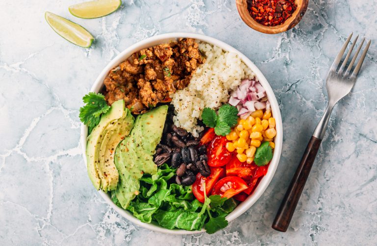 6. Next, assemble the burrito bowls. Start with a bed of rice and then top with the ground turkey mixture, black beans, shredded lettuce, avocado, pico, sour cream, etc.