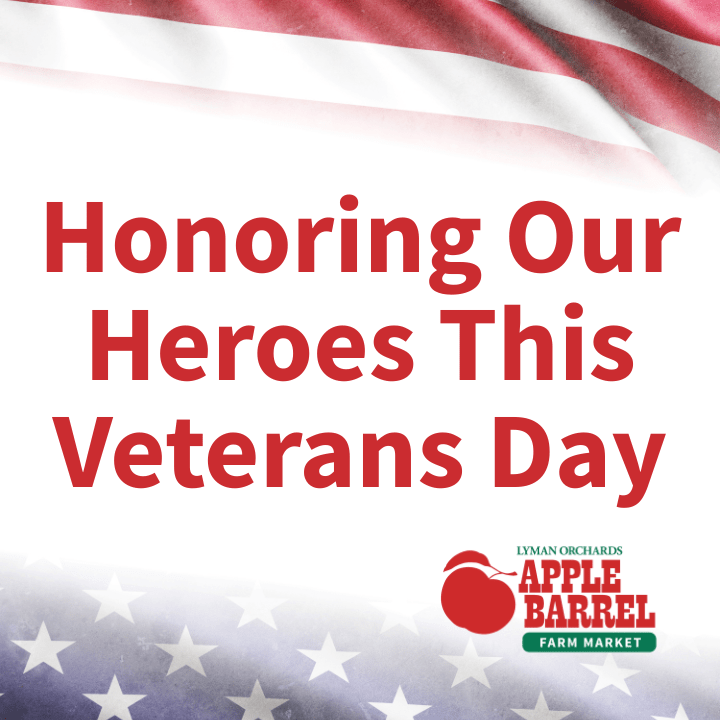This Veterans Day, Lyman Orchards is proud to recognize the brave men and women who have served our country. On Tuesday, November 11, 2025, all Veterans and Active Duty Military are invited to visit the Apple Barrel Farm Market and enjoy 20% off their purchase as our heartfelt thank you for their service.